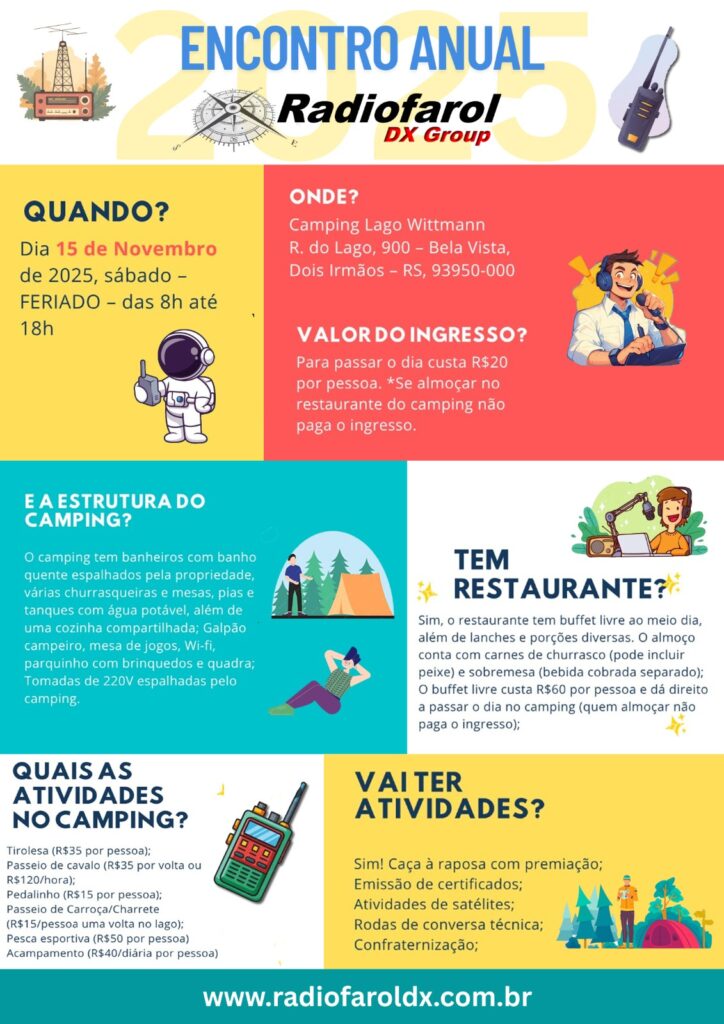 Na foto: Marcelo Konarzewski – Anatel, Andreas Hank Stern (PU3AHS) – Anatel, Carlos Portolan (PU3CAP) – Voluntário do ICF, Alexandre Martini (PU3MIP) – Radiofarol, Mauricio Peroni – Anatel, Fernando Troian (PY3TR) – Radiofarol e Vinicius Marafiga (PU3GFM) – Radiofarol No dia 29 de outubro de 2025, a coordenação do Radiofarol foi convidada para se fazer …