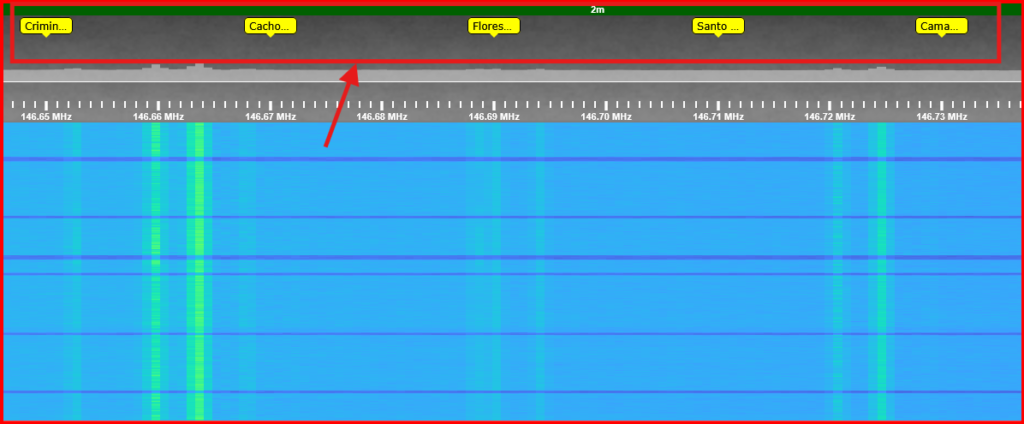 Na parte superior da página você pode acessar as memórias do SDR (imagem abaixo). São registros salvos pelo mantenedor para facilitar a navegação pelo espectro. Nas memórias constam as principais repetidoras, o inicio e fim das sub-faixas, APRS, satélites e principalmente a identificação de Criminosos que utilizam o espectro sem habilitação da Anatel. Para utilizar uma das memórias basta clicar nela com o mouse.