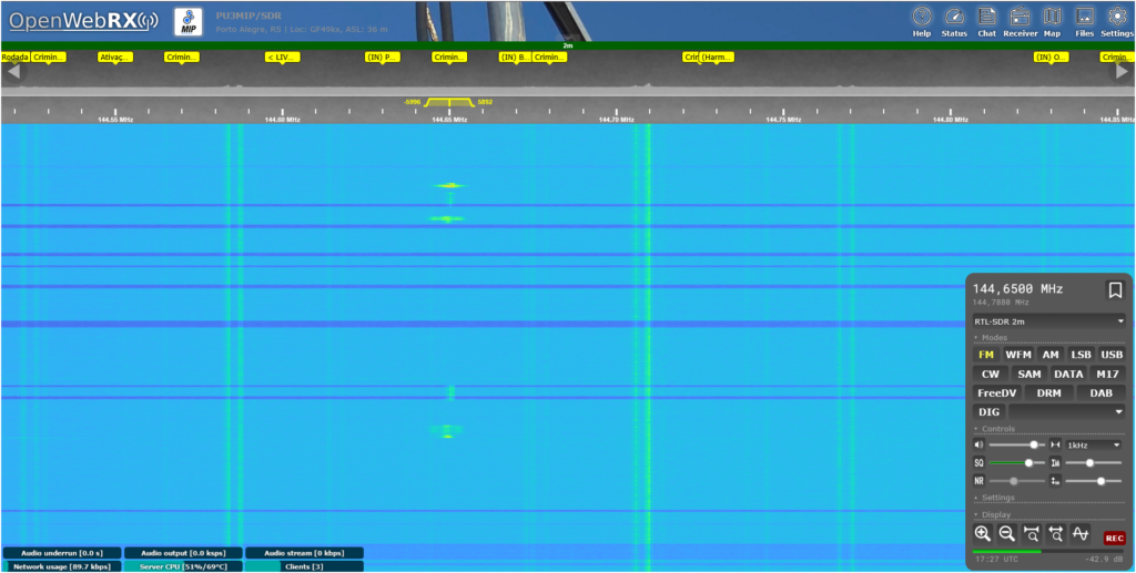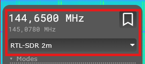 Na parte superior do receptor temos a frequência sintonizada e a banda (2m, no exemplo da imagem abaixo). Aqui você também pode digitar ou selecionar com o mouse a frequência desejada.