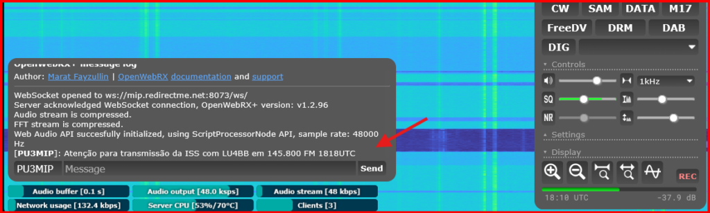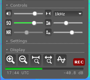 Ainda no receptor, temos os controles de Volume, silenciador, filtro de ruído, controles de tela e o botão “[REC]” (bastante utilizado para gravar os sinais recebidos – o SDR gera um arquivo com o áudio no formato .mp3 para download)