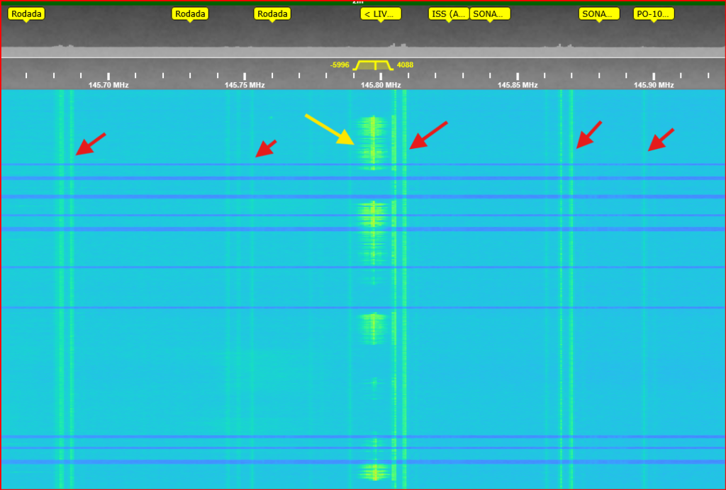Hoje em dia nem todos os sinais no espectro são “aproveitáveis”, respeitando o contexto de cada pesquisa. O espectro está tomado de interferências, piratas, não-piratas operando em sub-faixas incorretas e etc e tal. Para diferenciar os sinais você deve ficar atento já que as transmissões são representados visualmente como “riscos” modulados (conforme o modo transmitido). E quanto mais forte o sinal recebido pelo SDR, mais a cor se aproxima do espectro vermelho.