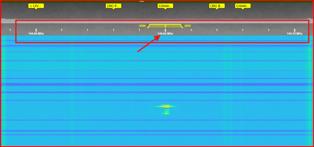 Na imagem abaixo, usada como exemplo, apontado em AMARELO podemos ver um sinal claramente modulado – é uma transmissão de voz, seguido de outros sinais apontados em VERMELHO – são interferências (geradas por agentes naturais ou por equipamentos próximos do receptor).