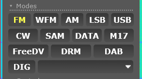 Em seguida temos os Modos (FM, AM, SSB, etc), e entre eles diversos modos digitais com decodificação em tempo real na tela (por exemplo: selecione uma frequência de FT8 e escolha o modo correspondente, ou ainda clique em APRS nas memórias e acompanhe a decodificação direto na tela do SDR; Veja exemplo mais abaixo)