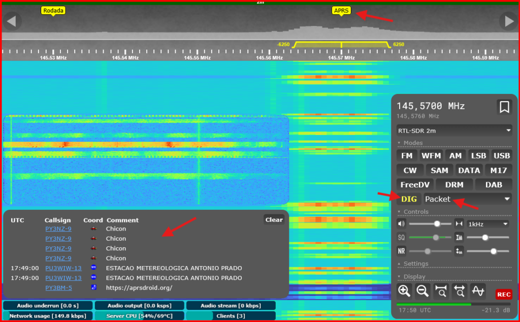 Abaixo um exemplo de decodificação de APRS em tempo real diretamente na tela do SDR. Ainda sobre o tópico anterior, note que o sinal é visualmente diferente de uma transmissão modulada “por voz”.